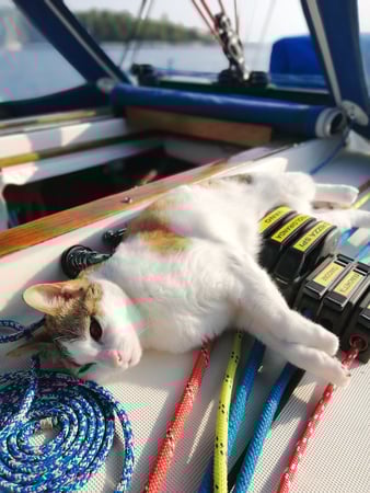 VelaKi's crew was formed by co-skipper Sari and their beloved sailing cat Kekku! Unfortunately in October 2025 our over 17 year old lady cat Kekku went sailing the seas of sky. She had a 9 year career on board as vice commander and we truly miss her.